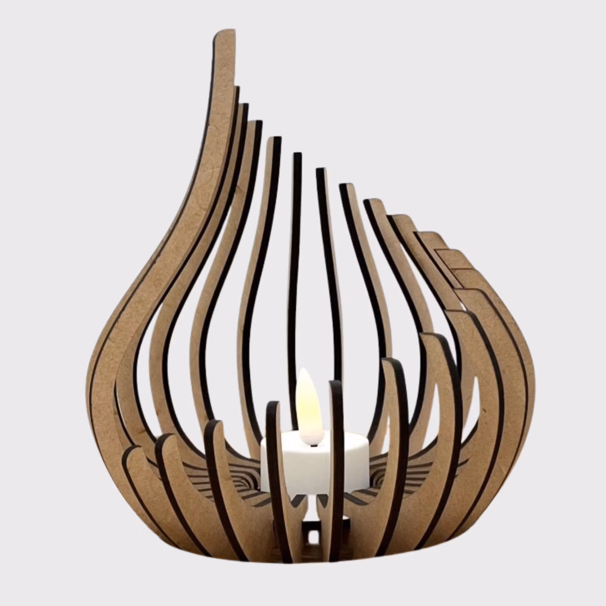 Holderen er skåret i svart MDF med diodelaser, noe som gir presise detaljer og et uttrykk som er både moderne og stemningsfullt.