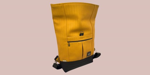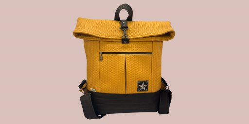Ryggsekk i Okergul flettet imitert skinn, Gunmetal / Svart hardware.
