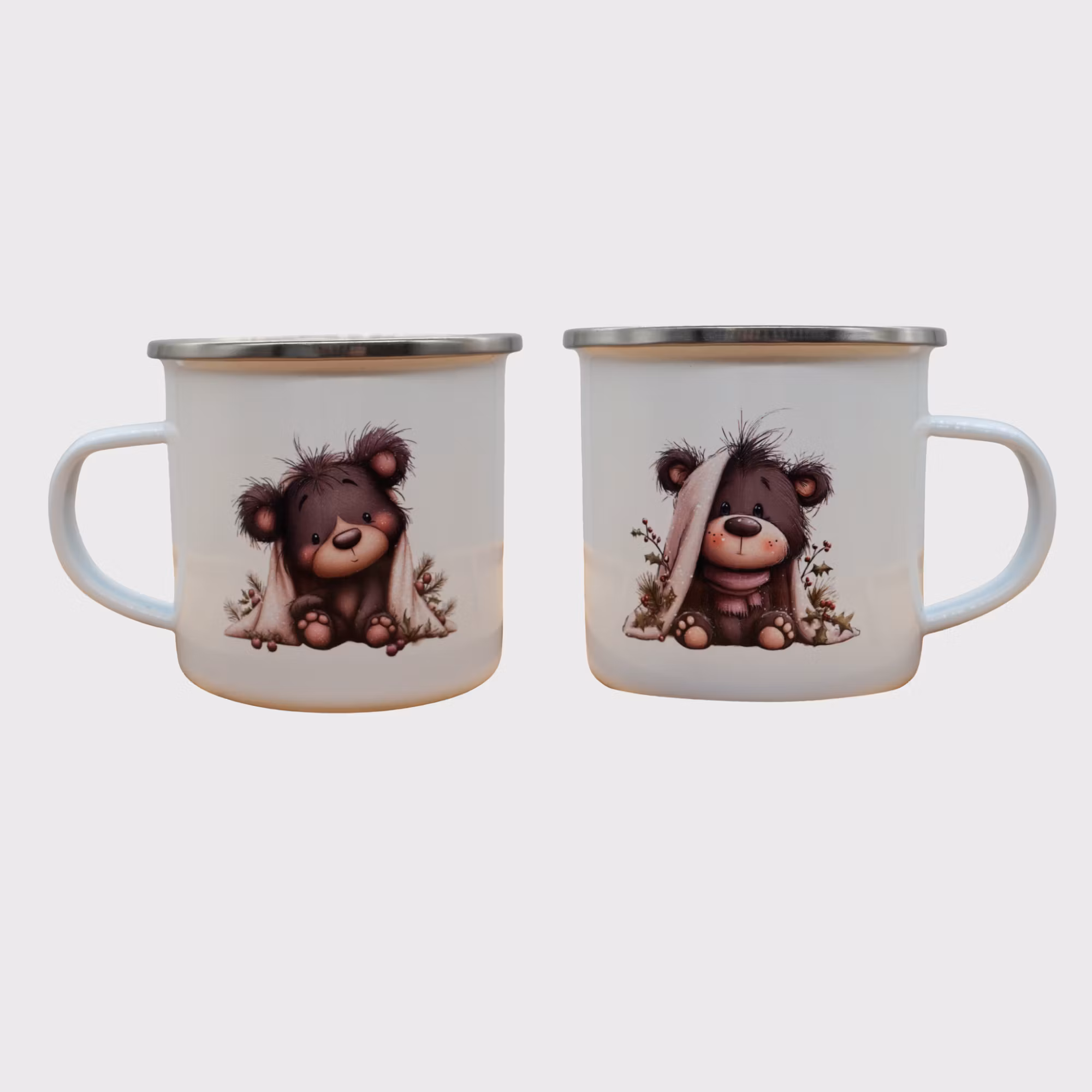 En sjarmerende emaljekopp med to forskjellige bamser, én på hver side. Perfekt til varm eller kald drikke.