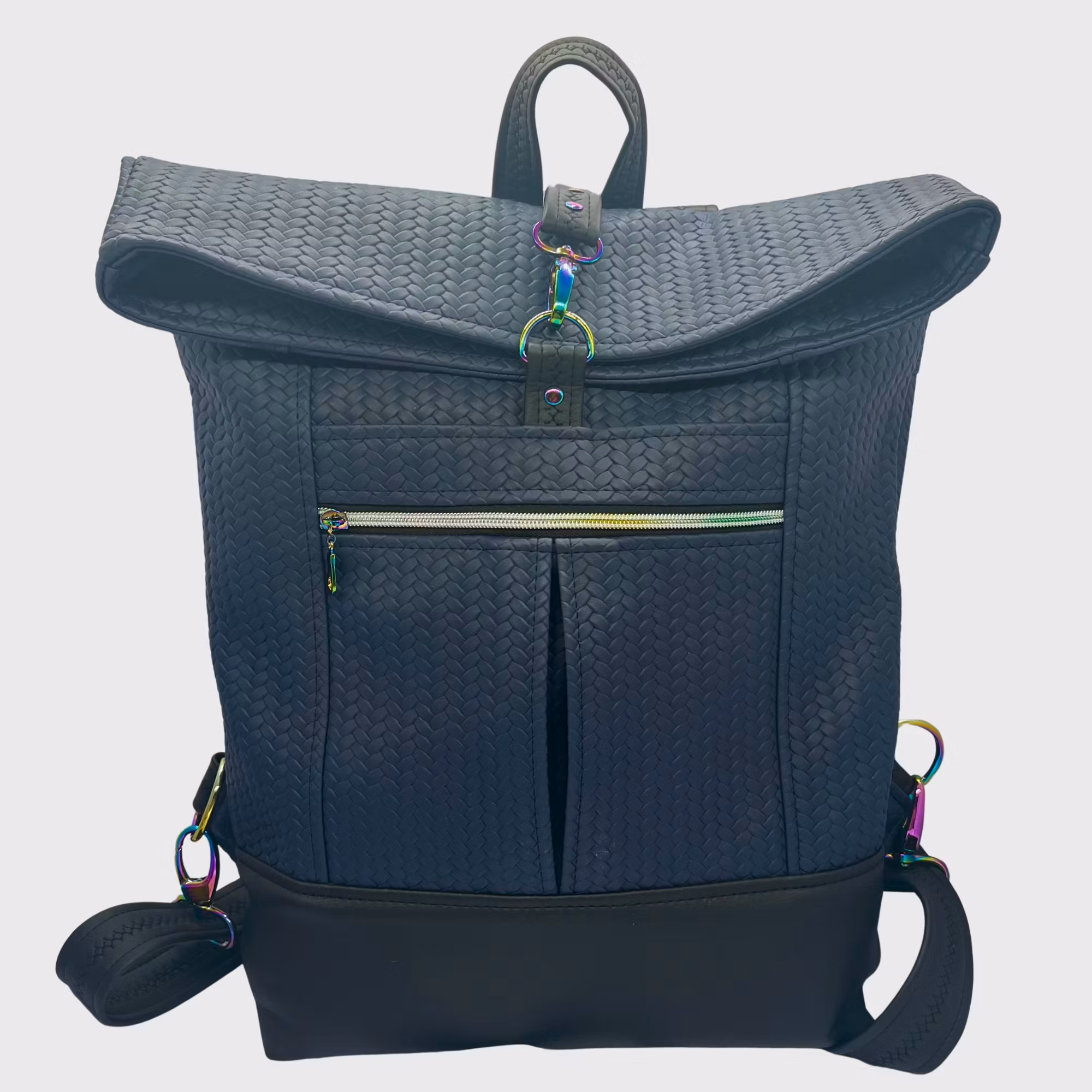 Ryggsekk i mørk blå flettet imitert skinn, rainbow hardware.