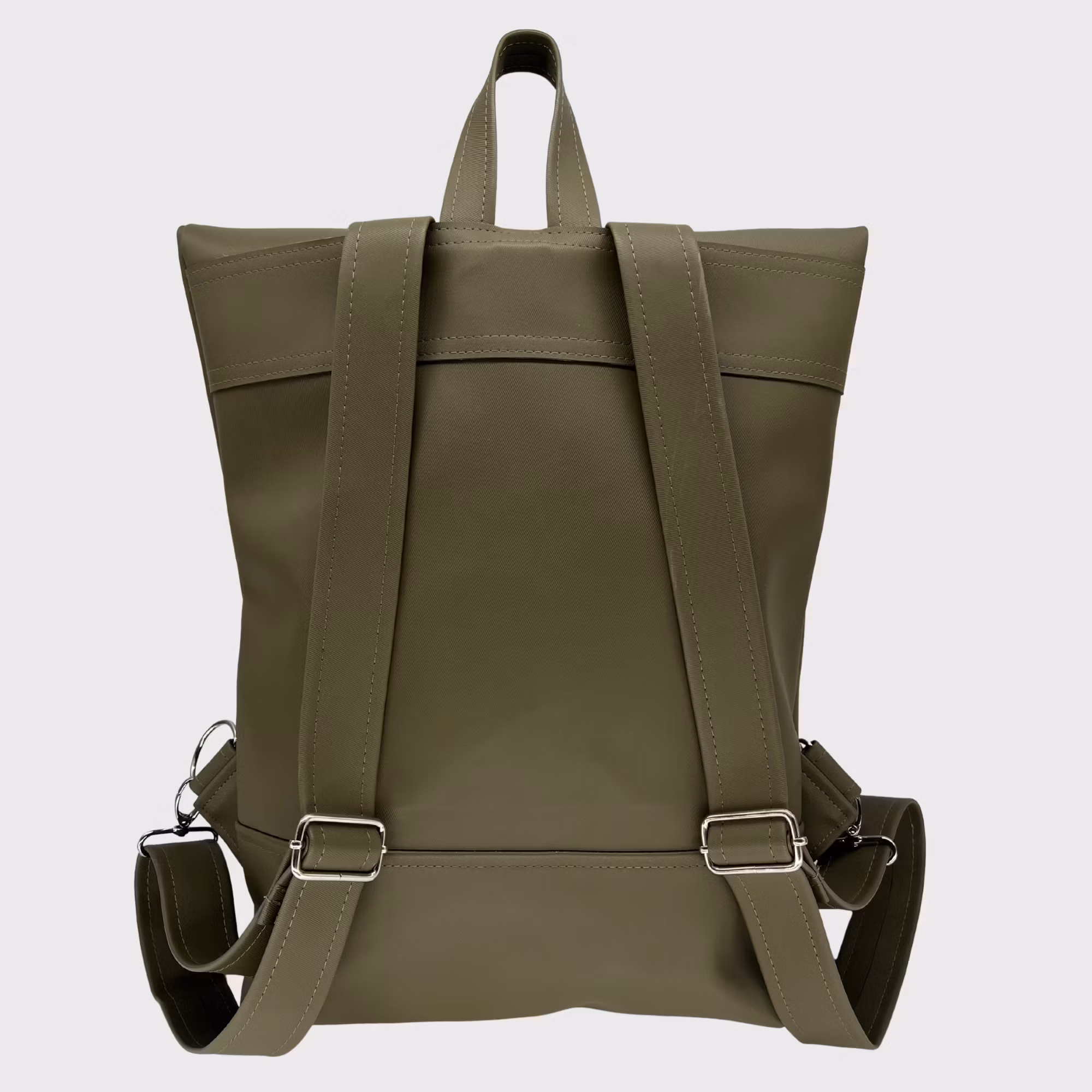 Ryggsekk i grønn vanntett utendørsstoff, sølvfarget hardware.